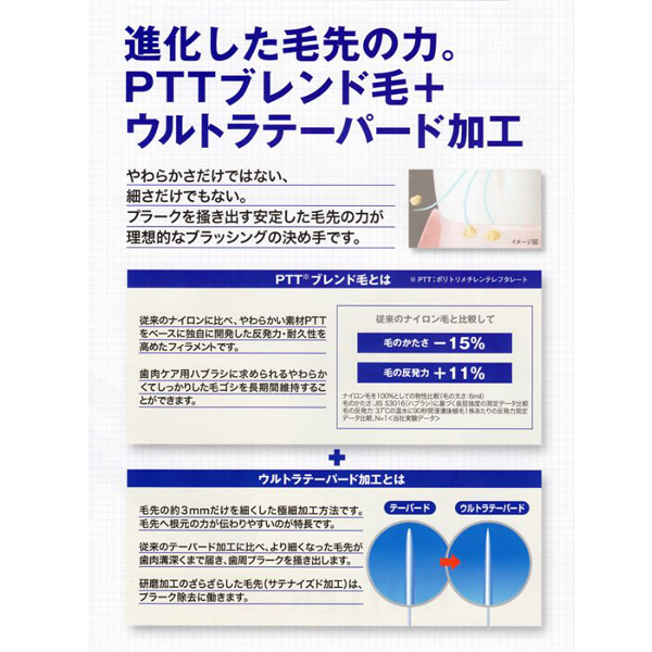 独自開発のPTT(ポリトリメチレンテレフタレート)ブレンド毛が高耐久でしなやかさを兼ね備えた極細加工を実現。
