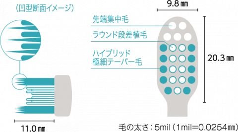 やわらかいハイブリッド極細テーパー毛をサイドに配置。